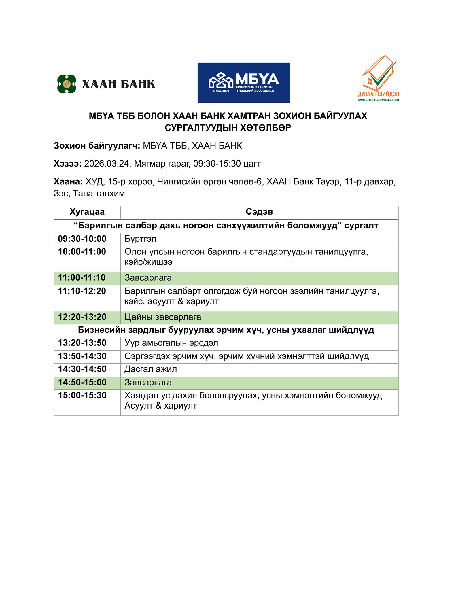 МБҮА ТББ болон Хаан Банк хамтран зохион байгуулах сургалтуудын хөтөлбөр